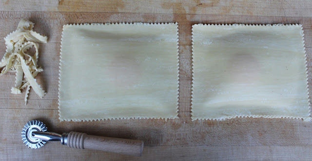 Lay out two sheets of fresh pasta dough, one to act as the base of the raviolo and the other as the top. I highly recommend giving my handmade pasta a try – recipe found here – but you can also find fresh pasta sheets at specialty food stores such as Lotsa Pasta in Louisville.