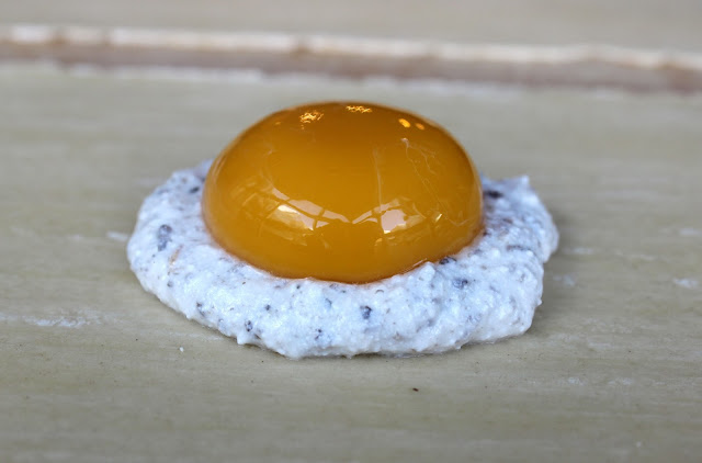 Place individual tablespoons of the truffle-ricotta mixture in the middle of the pasta sheet, spacing evenly. You will have enough ricotta for six ravioli. Use the back of a spoon or your finger to make a small dip in the ricotta mound. Carefully place an egg yolk in each divot of ricotta.