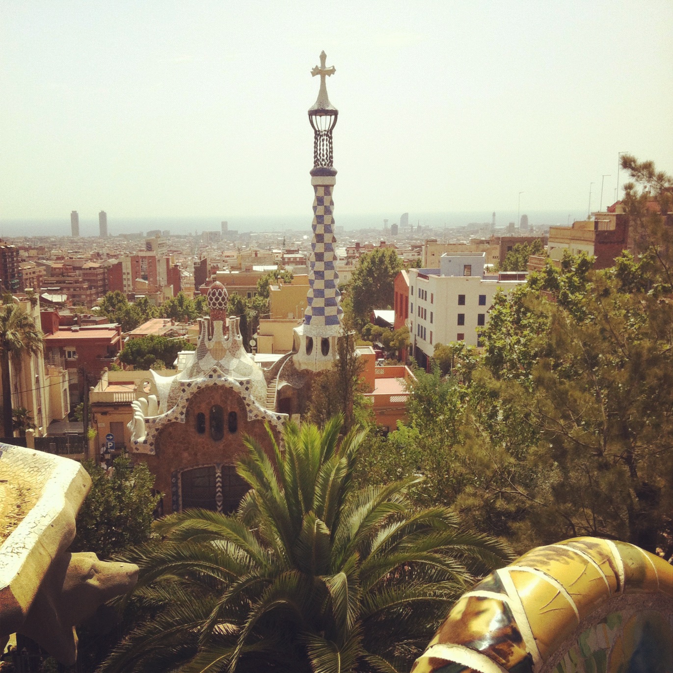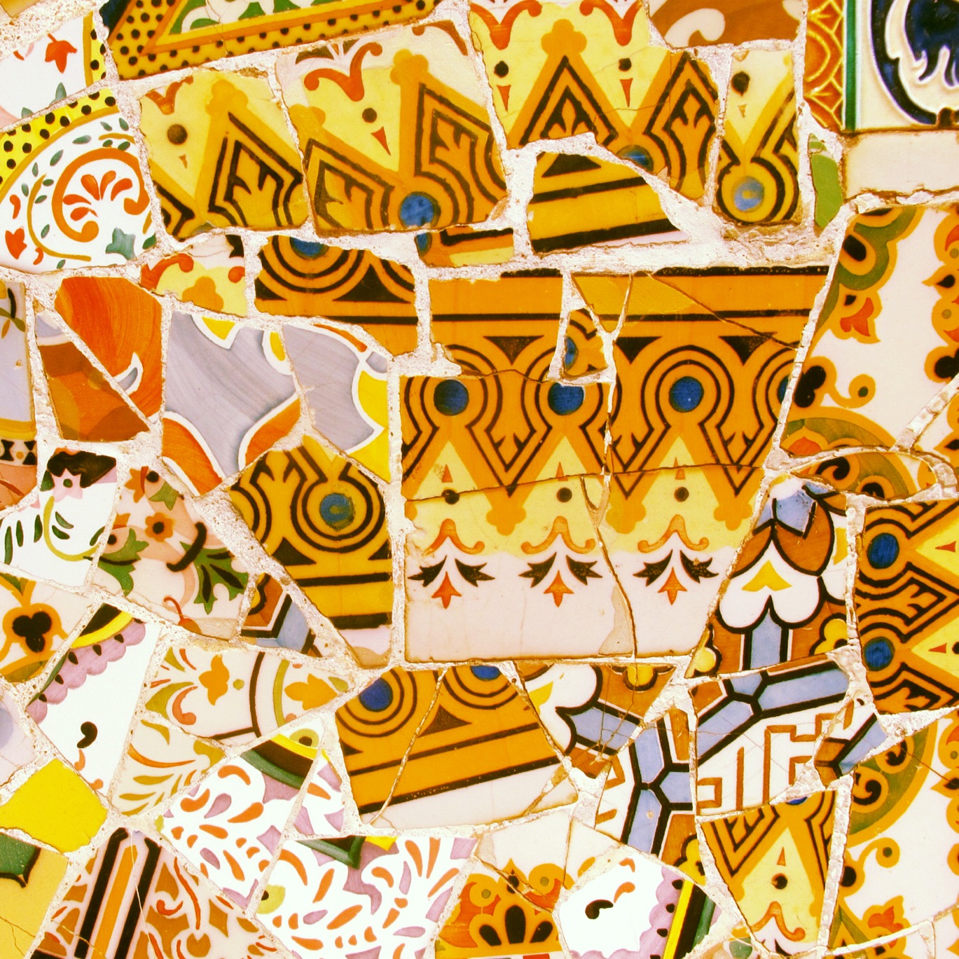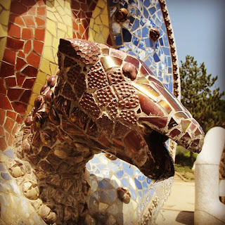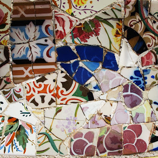 The intricate Gaudi tilework at Parc Güell. Located up the hill in Gracia, Parc Güell has a spectacular view of Barcelona. Just as beautiful as the view, is the intricate tilework made up from broken and damaged crokery that covers so much.