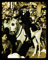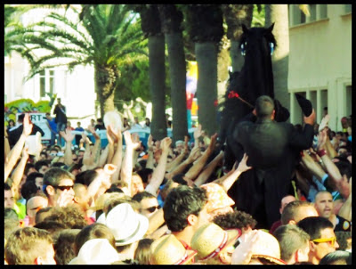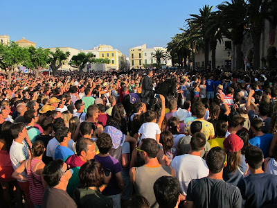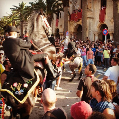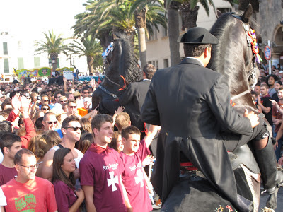 ..Menorca, 24 June. Fiesta de Sant Juan. Throughout Cataluña this is a big festival. In Ciutadella in Menorca they have their own traditon called the ‘Jaleo’. There are many events which lead up to the official procession of riders through the city to the Mayoral Office where they display their riding skill and receive blessing for the Equestrian Games which follow. It is a melee of hooves and heads and astonishingly, no-one lost an eye!! Spectacular!