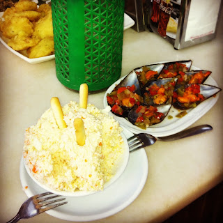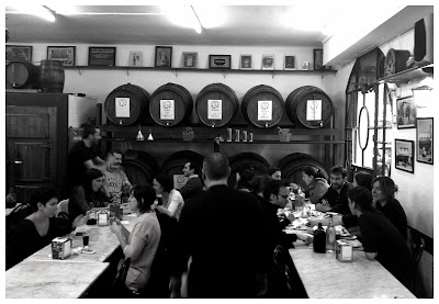 … tucked in on the market square in Barceloneta, is this vintage vermut bar, open 09h-15.30h (& 19h-22h). On a Saturday or Sunday it is filled with the locals who come to have their morning vermut (of which there is a selection) and soda, accompanied by tapas… mejillones (muscles), or bacalao or jamón or bombas (potato filled with meat then fried). A delicious way to start Spanish Sunday (after the gym, of course!)