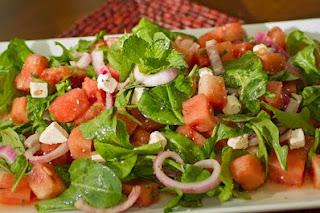 Cut the watermelon into 1-inch chunks using only the ripest, redest part of the melon and put into a bowl. Drain the onions, reserving the liquid, and add them to the watermelon along with the arugula, feta and mint. Whisk together 2 tbls. of the reserved liquid with ¼ cup olive. Drizzle over salad and toss gently.