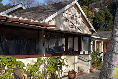 Burgers and Brew is my daughter’s favorite burger place in Davis, CA. I went up to visit her at school on a Sunday at lunchtime. The small cottage was packed. They have turned the porch into outdoor dining. But this was a very cold day at Davis, so they had plastic draped over the openings and heaters straining in vain to keep the place warm.