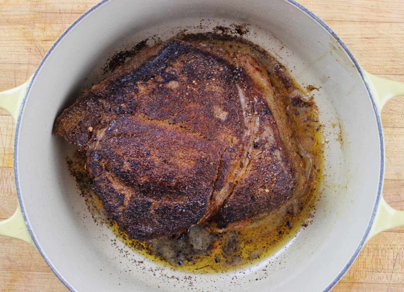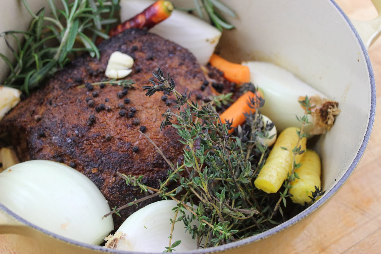 Warm a heavy-bottom pot (a dutch oven is ideal) over medium heat and add one tbs olive oil and one tbs unsalted butter. Brown the roast on both sides for four minutes, creating a nice sear. Next, add the onion, garlic cloves, carrots, thyme, rosemary and whole peppercorns to the pot.