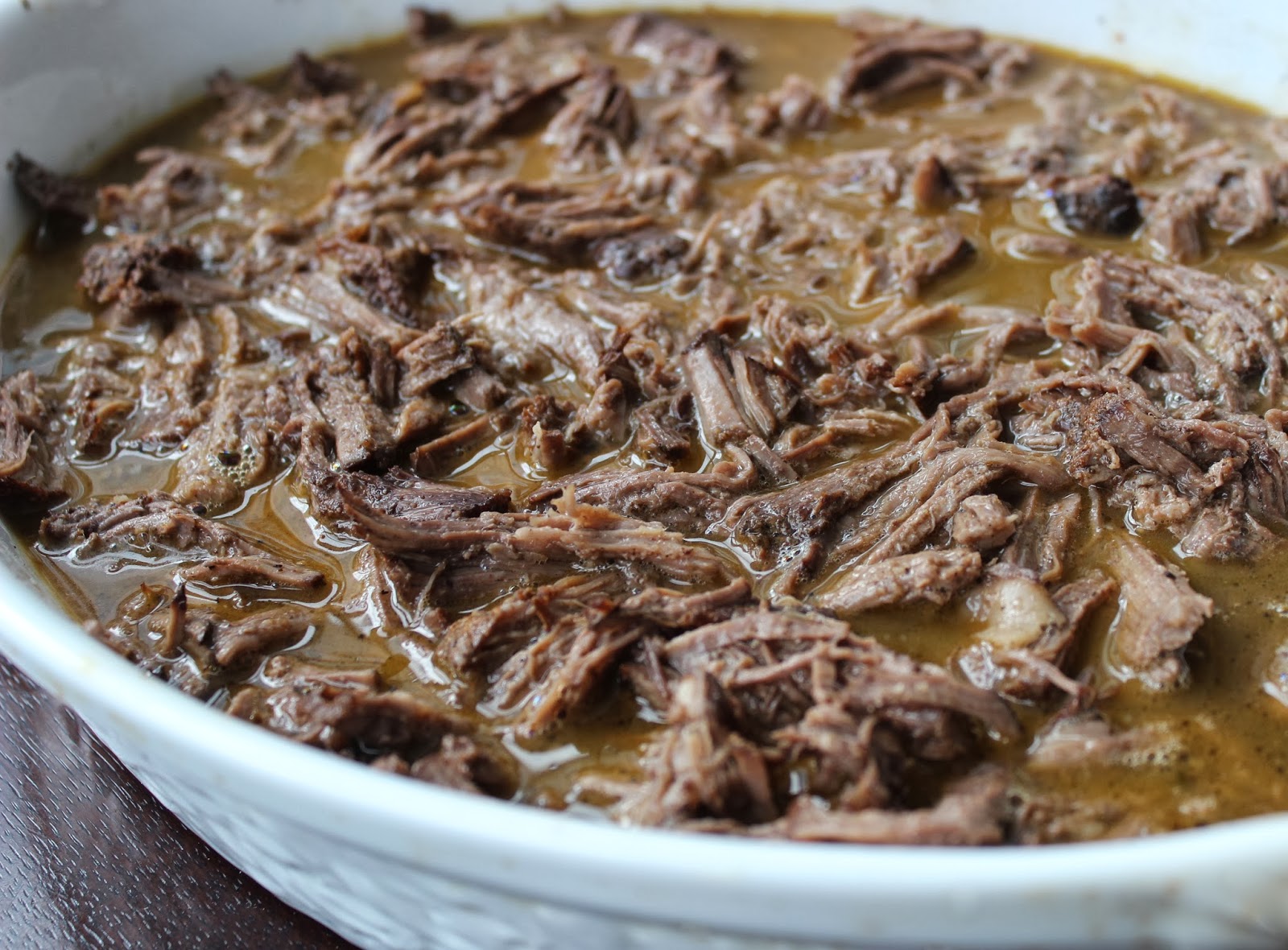 Preheat the oven to 200 degrees and cook the roast for seven hours. Remove from the oven and transfer the roast to large dish. Using two forks, pull the beef apart, shredding it into bite-sized pieces and set aside.