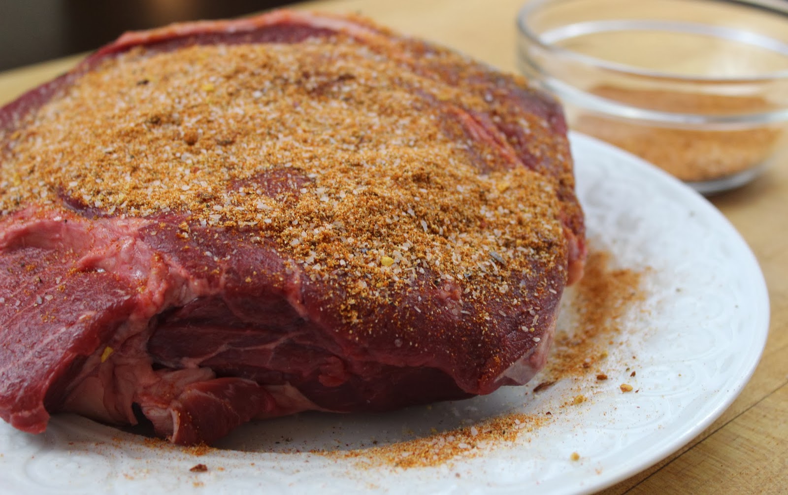 To begin, combine the kosher salt, red pepper flakes, cayenne, mustard powder, paprika, granulated garlic and black pepper together in a small bowl. Pat the roast dry and rub the spice blend over all sides of the beef.