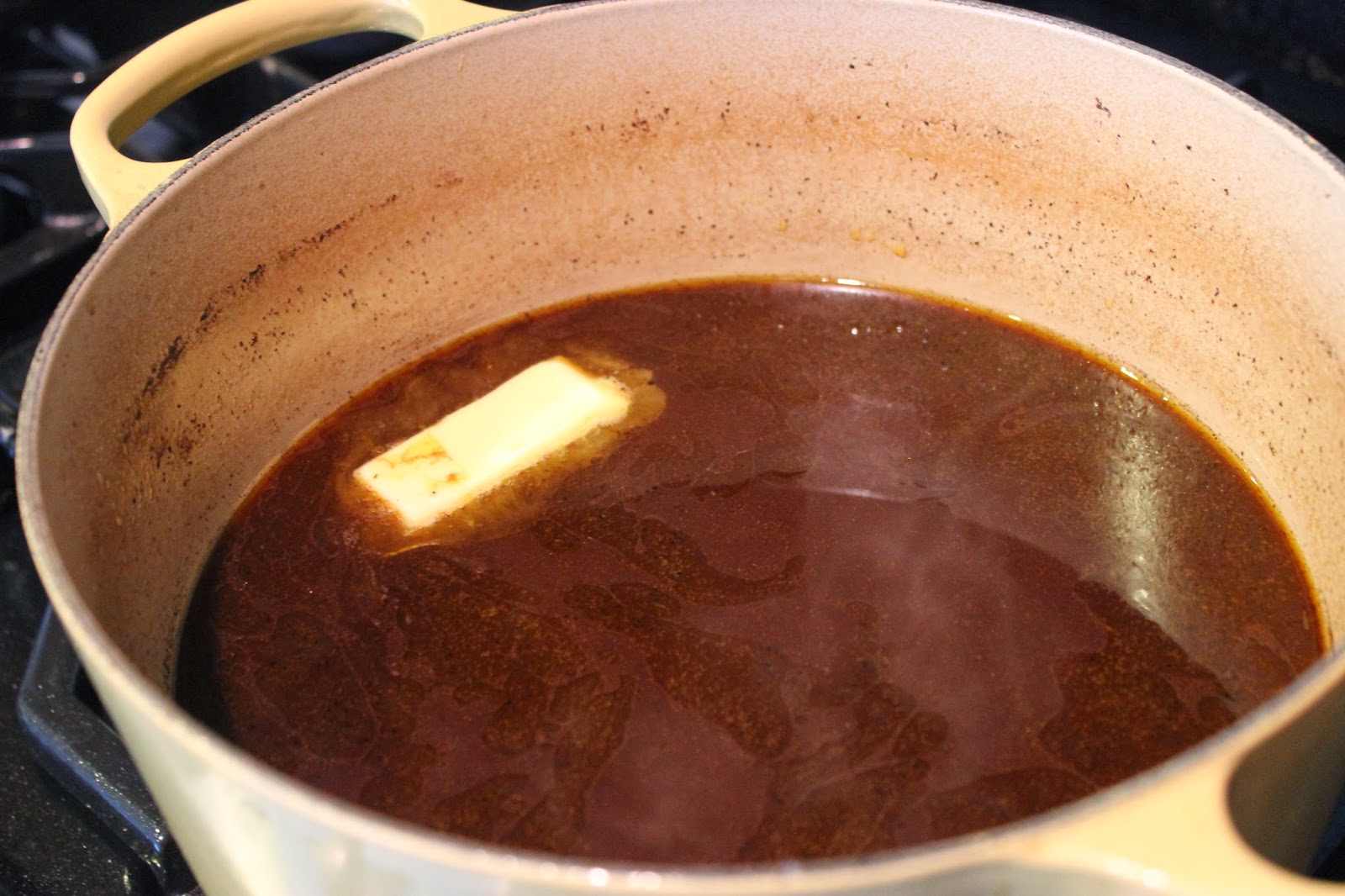 Once reduced, lower the heat and add four tbs of cold, unsalted butter, whisking to combine until glossy and smooth. Taste for seasoning and add additional salt and pepper, if necessary.