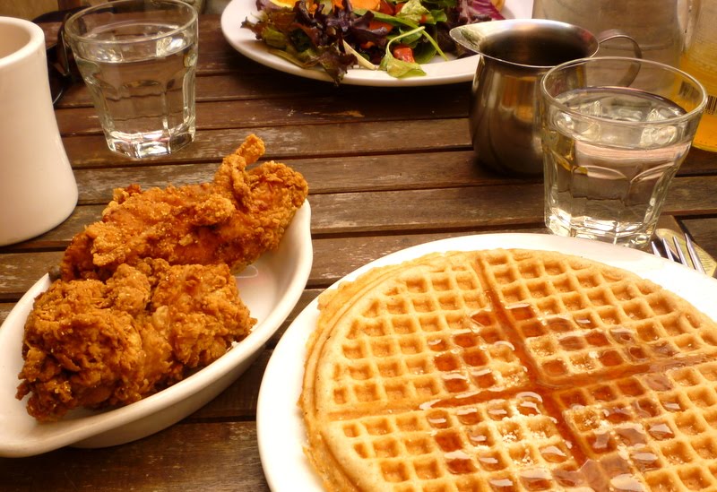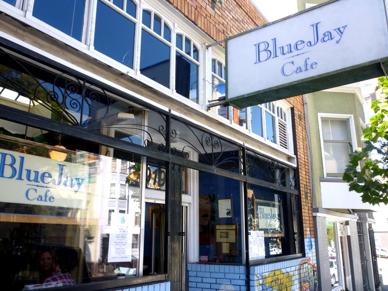 For more civilized al fresco dining (table service and no lines!) I spent a lovely morning having brunch with friends on the small and charming patio at the rear of the Blue Jay Cafe on Divisadero, which serves wonderful fried chicken and waffles. I’ve always loved the atmosphere at this American-style diner with its big horseshoe-shaped counter, but hadn’t stepped out back. There are only three or four tables, but it’s warm and cozy, with tall brick walls and big red umbrellas providing shade. The food is reasonably priced ($7.25 for the chicken and waffles) and there’s a lot of down home southern flavor, with biscuits and corn muffins always on the menu.