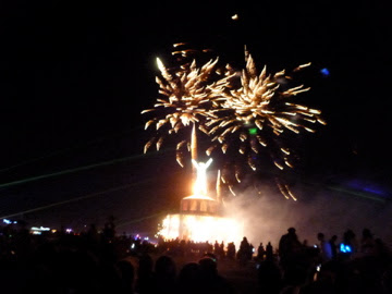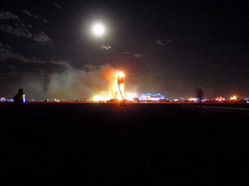 Around 8:30 the fire conclaves start to spin. There are 25 or 50 of them, completely circling the man. They have all worked on routines and shows for months or even the entire year for this 15 minute window. Conclaves can have up to 50 people, including the safety folks, and she shows are pretty impressive. Burn Academy (who I camped with) did “the Four Horsemen of the Apocalypse”. They had folks on stilts, burning swords, girls with these burning frames on them. It was really cool. Burning Sensation (which was right next to them) did a sexy, salsa dance to start with (But they had burning staffs they encircled each other with), and there was a dude with a FLAMING WHIP! Indiana Jones would be proud.