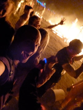 The heat was insane. If you were on the inside of the river, it was 5 feet between you and a 50 foot square of burning wood. It was HOT. Really HOT. Blistering hot. But if you had just one person between you and the flames it wasn’t too bad at all. (I guess people make good insulation…hmmm, that’s a weird statement. :). I don’t know how the naked guys and girls could stand being that close to the flames. I ran into some friends from camp, snapped their pics, and just enjoyed the absolute insanity of the whole thing. This was participation done burning man style.