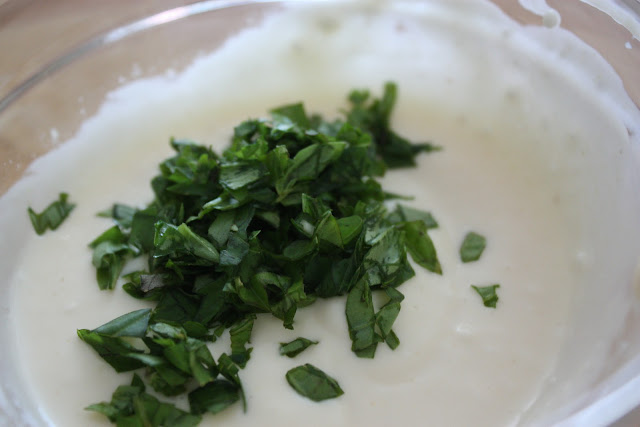 A simple smear of mayo will do just fine, but why not dress it up a bit! Add to a bowl, two tbs mayonnaise, one tsp dijon mustard, one tbs minced basil, the juice of half a lemon, four dashes hot sauce and a pinch of salt and blend until smooth.