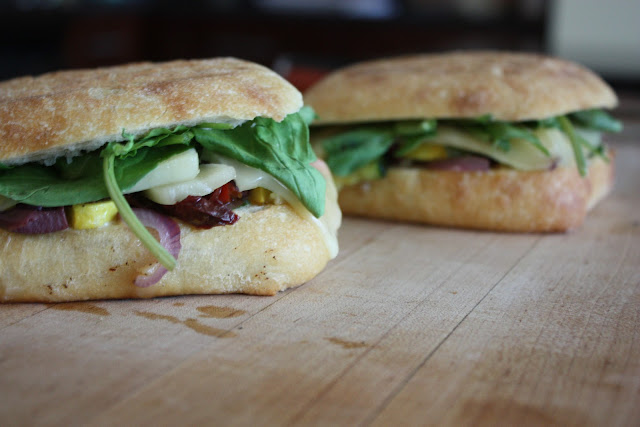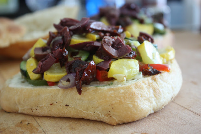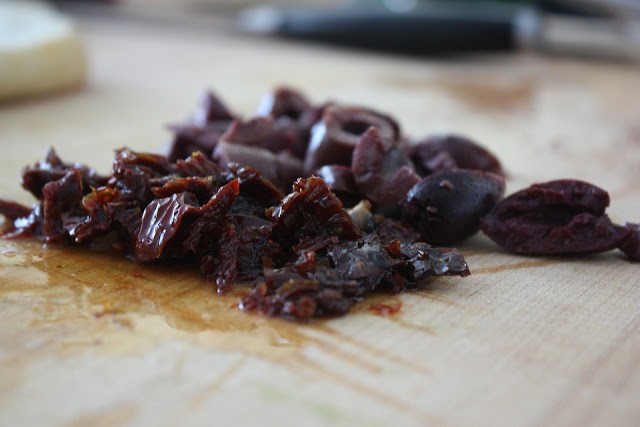 While the vegetables are roasting, prep the accompaniments. I love sun-dried tomatoes and kalamata olives and think they are a fantastic addition to this sandwich. The roasted veggies have a slight sweetness and the sharp, briny flavors of the olives and the rich, intense overtones that the sun-dried tomatoes bring are wonderful counterparts to the other elements that make up this sandwich.