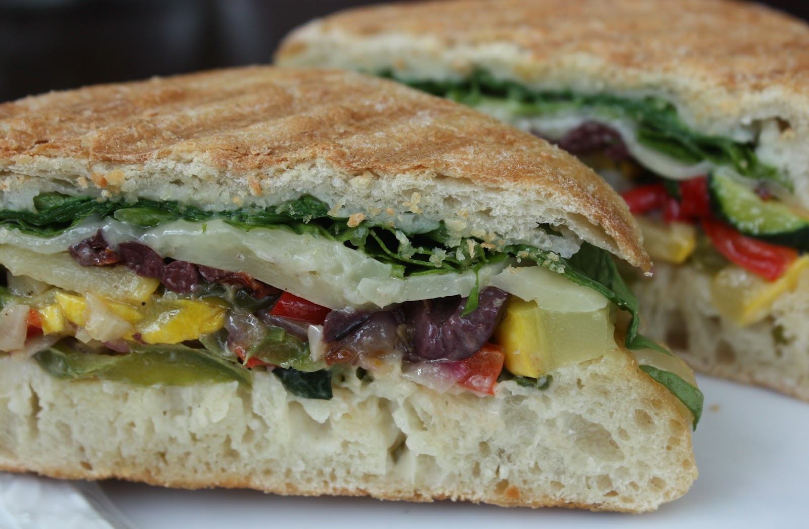Top the veggies with a slice of havarti cheese – it melts beautifully! – and warm on a panini press for five minutes until the cheese is oozing out of the sides and the bread is crusty and toasted. If you don’t have a panini press then you can toast the sandwich on 350 for five to ten minutes, placing a heavy bottom, oven safe pot on top of the bread, pressing it onto itself.