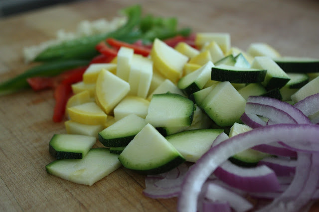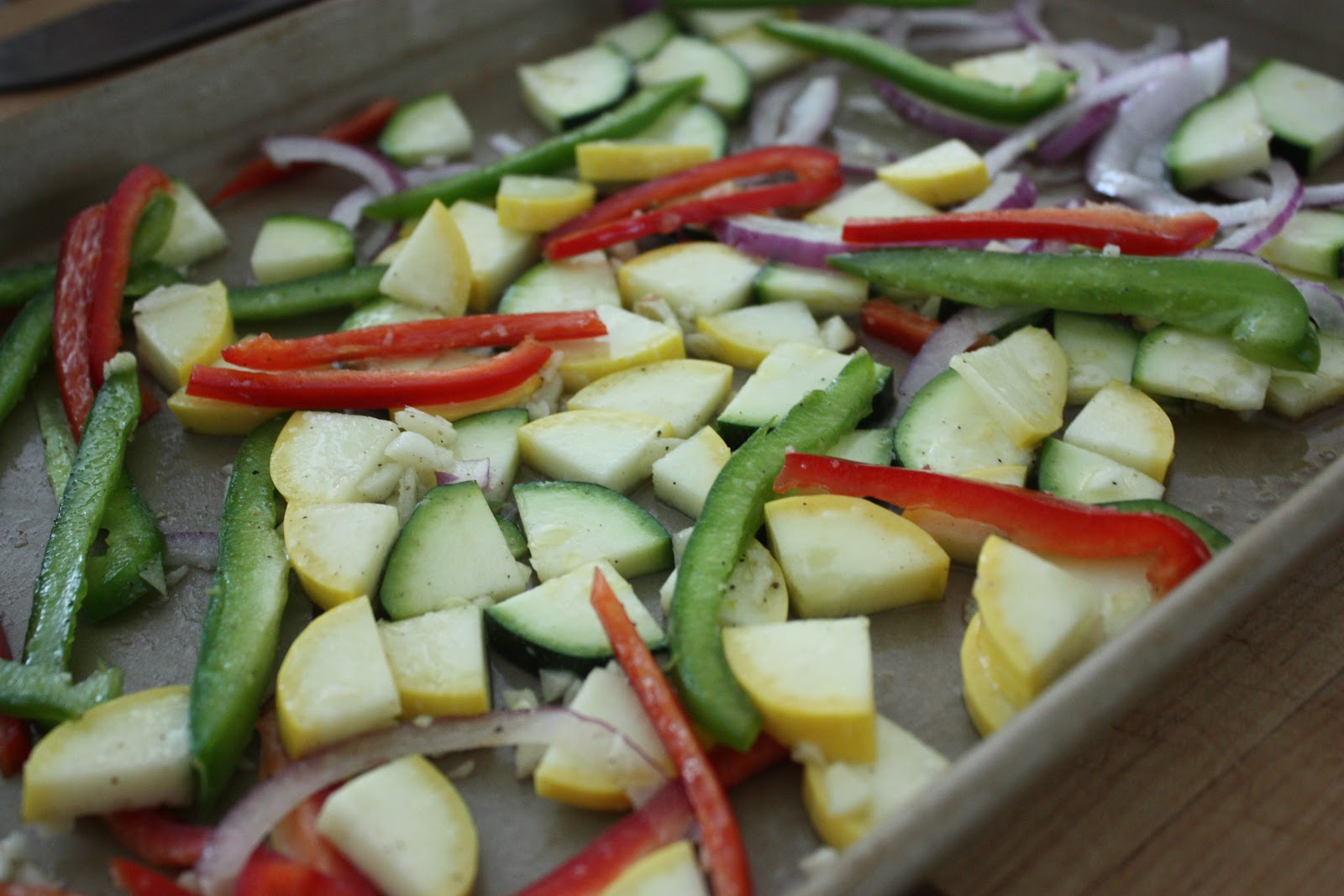 Preheat the oven to 425 degrees. Just about any fresh veggies will do here, but I highly recommend this combination: one quarter of a red onion, thinly sliced, one half cup yellow squash, chopped, one half cup chopped zucchini, one half of a small red pepper, thinly sliced, one half of a small green pepper, thinly sliced and one clove garlic, minced. Toss with one tbs olive oil, one half tsp kosher salt and one quarter tsp pepper. Roast for ten minutes, remove and toss the vegetables, and then roast for an additional five minutes. Remove from the oven and set aside.
