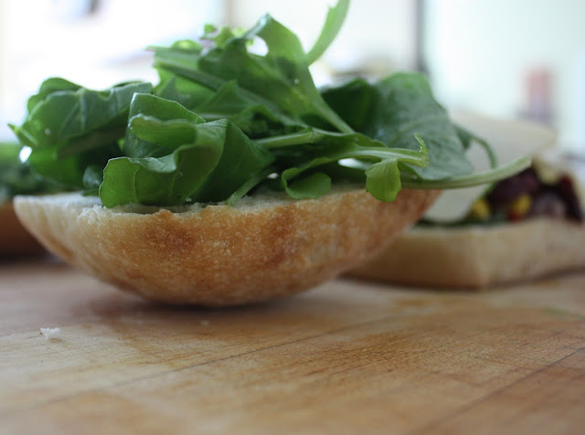 Slice the rolls in half and tear the bread from the center of the top half out, creating a small hole where the veggies and some peppery, leafy arugula can hide.