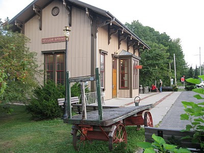 The Yellow Springs station. Once a true train station, the rails are gone and its original purpose has given way to a rest area and information center for cyclists. With a public restroom and drinking fountain, as well as endless brochures and a map of the bike trails throughout the area, this is indeed a welcome center for all those arriving to town by bike.