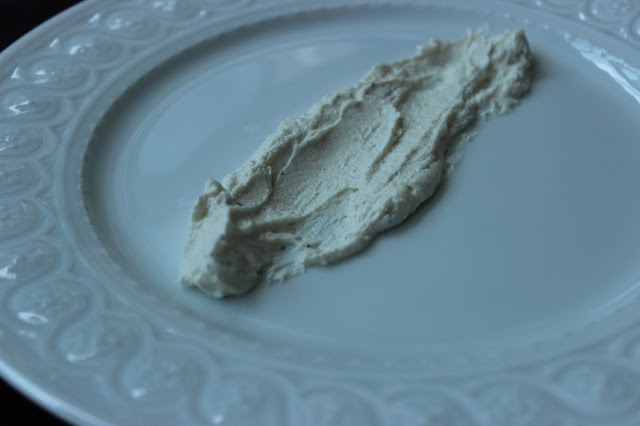 Using a spoon, place one dollop of the goat cheese into the center of a plate. Take the back of the spoon and spread the cheese into a line, stretching from one end of the plate to the other.