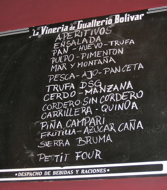 I will not say that every course was perfection. Some where stronger than others. But to see that level of experimentation taking place, to be brought into their intricate web as they literally told us a story through their food. It was exhilarating, delicious and emotional. It was worth so much to us… FAR more than the mere $100 USD/each it cost (this includes tax, tip and two fantastic bottles of Argentinian wine). A value that cannot be recreated. I can only hope to return to La Vineria de Gualterio Bolivar one day.