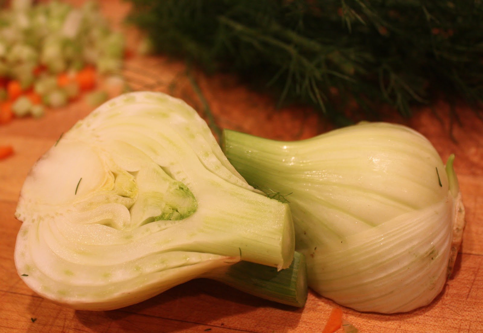 - one half and one cup diced fennel, plus fronds for garnish