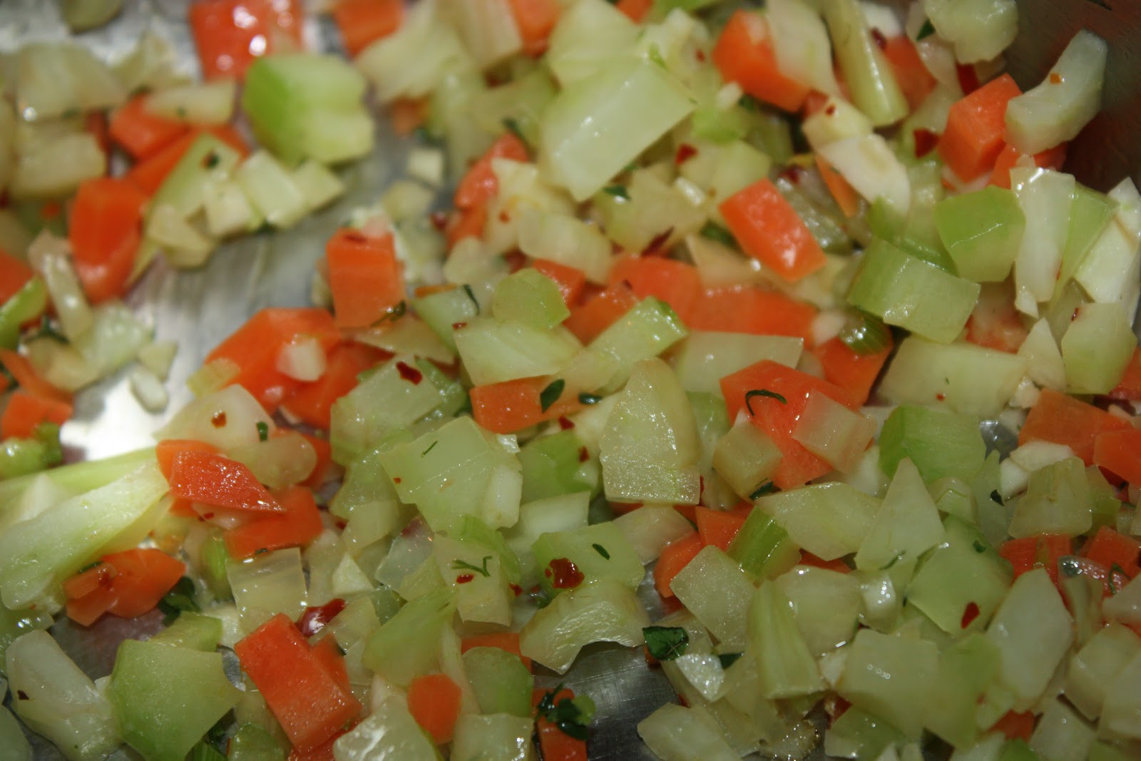 Allow the veggies to cook down for five minutes, stirring often. Once the fennel, carrots and celery begin to soften, add the garlic, thyme and one quarter tsp red pepper flakes. Warm for one minute until fragrant.