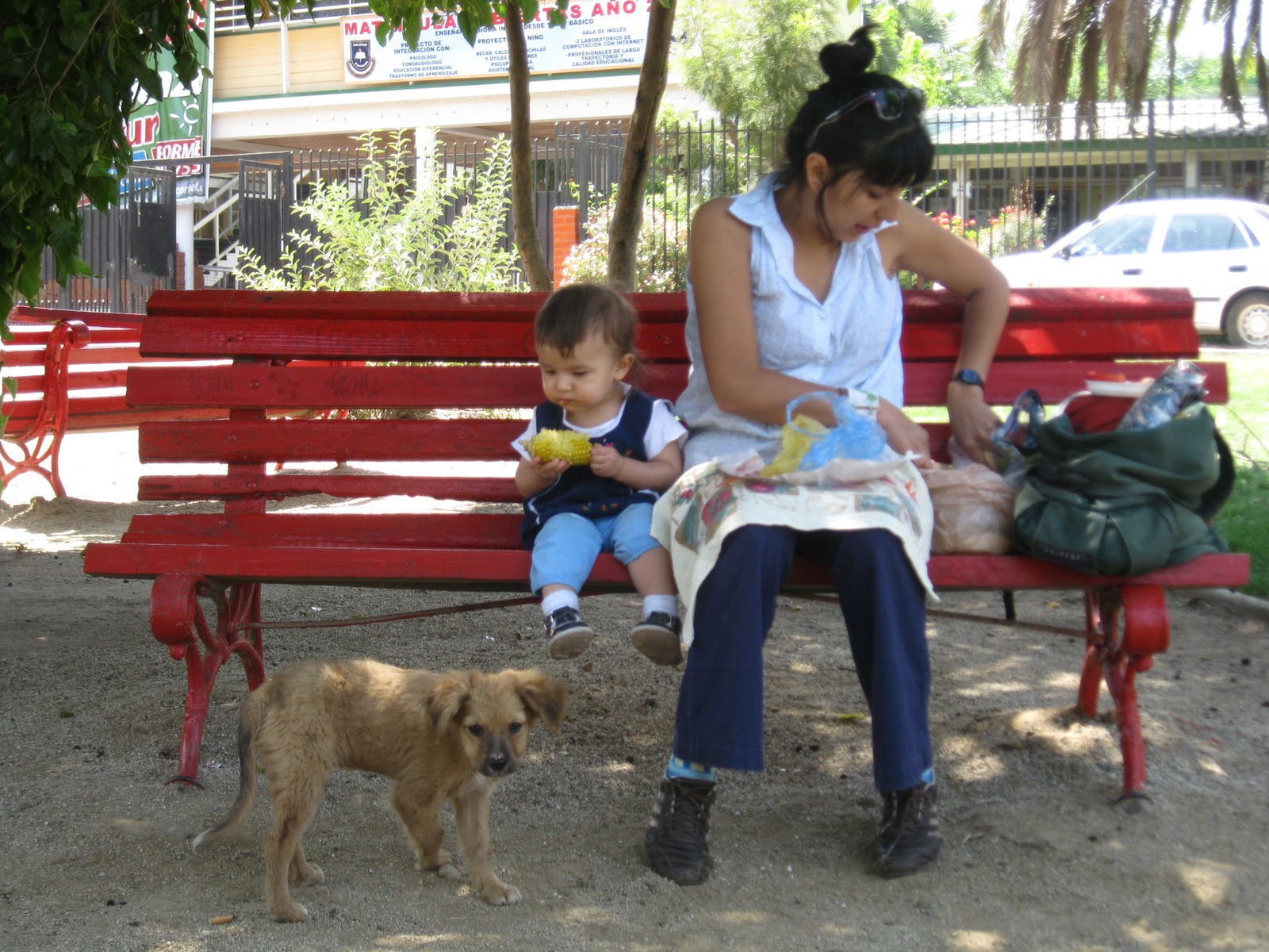 We didn’t know there were going to be empanadas in Pomaire until we got there, so we had packed our own lunch before we left home, and contented ourselves with a picnic lunch in the park. We didn’t feel like we were missing out; it’s an easy and pleasant trip out of the city, and we’ll be making it again. The next time, we’ll try the food. For the time being, we had some nice sandwiches and corn on the cob, and shared our mealtime with a pack of hungry puppies who wouldn’t leave us alone. Hence lunch on a bench instead of in the grass, safely out of their limited reach.