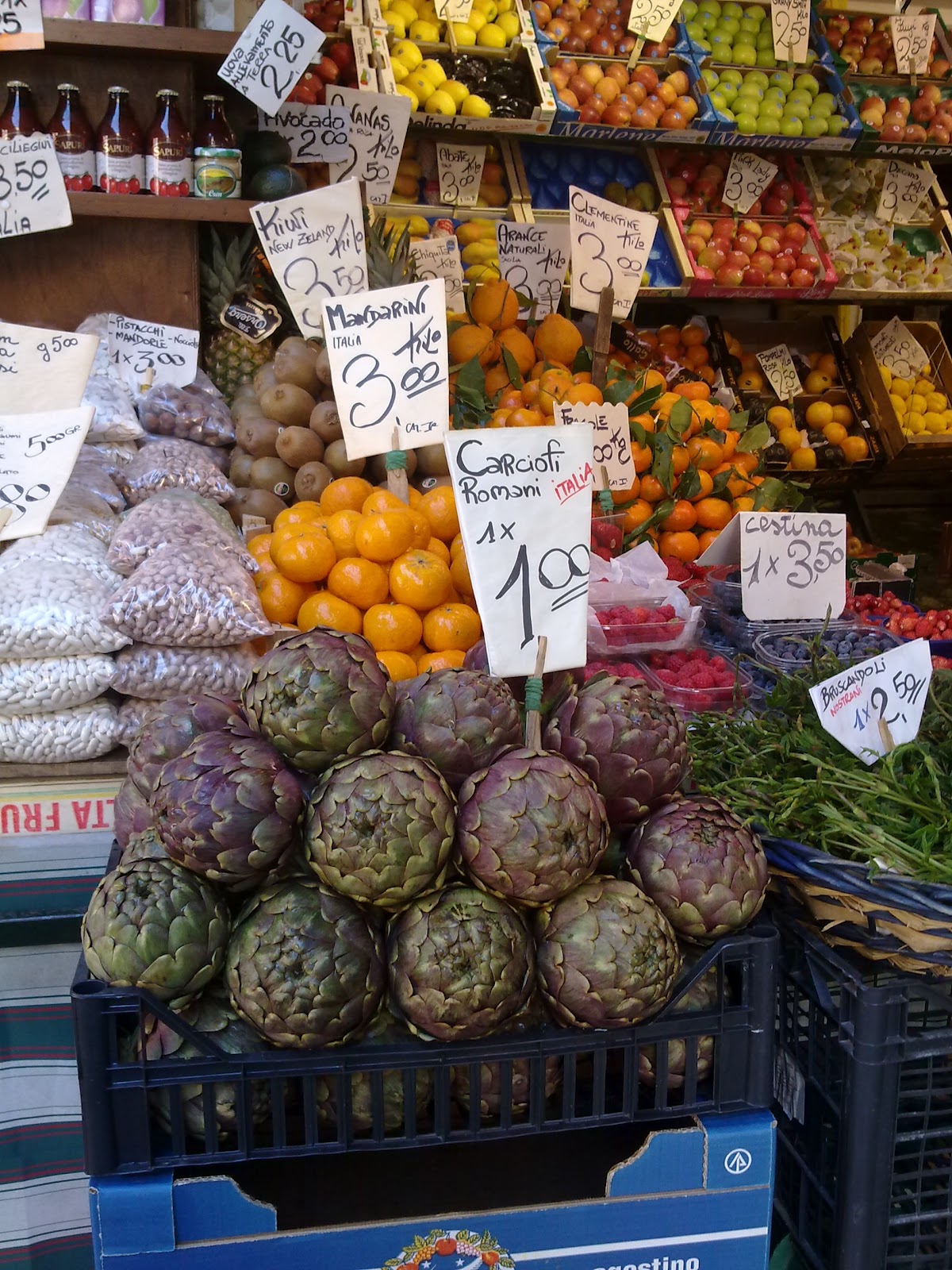 On our way to Piazza San Marco, Venice’s most famous landmark, we happen across its well-known Rialto Market. Amidst strings of dried hot peppers and braided garlic, artichokes bigger than a closed-fist, and olives painted in rich hues of golden-beige, violet –black and yellow-greens, resistance is futile. I whip out my camera and start snapping pictures and ignore Jesus’ quiet sigh.