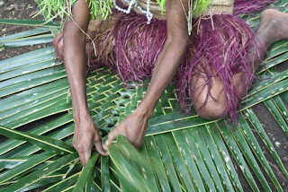 The dancers wear ankle rattles but don’t do much singing. But it’s all gorgeous and I’m so fortunate I get to experience this whole demonstration. There is a headress change and another dance then I’m taken over to where the women are chilling out. They show me how to make a fire then cook me grated yam in a bamboo over the fire. Then fresh coconut milk is poured over it. It’s so bloody delicious I’d ask for seconds if there was any more. Then the women show me mat weaving and all the toys they make with palm leaves. Meanwhile the kids are near to naked and are playing hopscotch in the center of the area. Kids are kids wherever you go. Some things just never change.