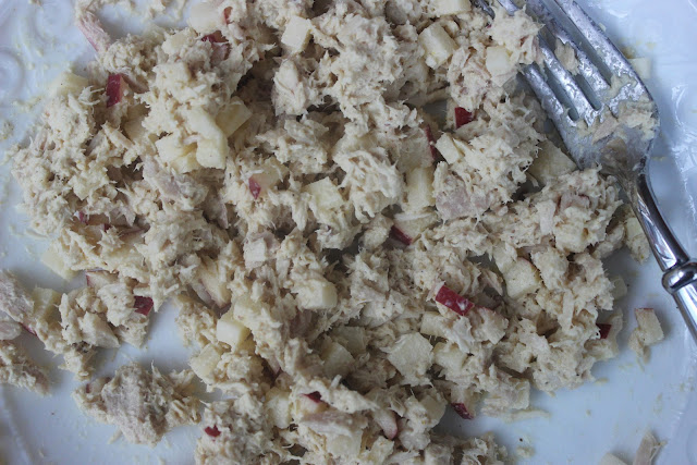 Right now the tuna-curry mix is flavorful but one-note. Apples will not only add a bright sweetness but they will also lend great texture to each bite with their crisp crunch. You want a red apple as opposed to green apple as they tend toward the sweeter side while the green varieties are more tart. Leaving the skin on, dice the apple into quarter inch cubes. You will need one quarter cup for this recipe. Gently toss the apple with the tuna. The lemon juice in the mayonnaise will help keep the apple from browning.