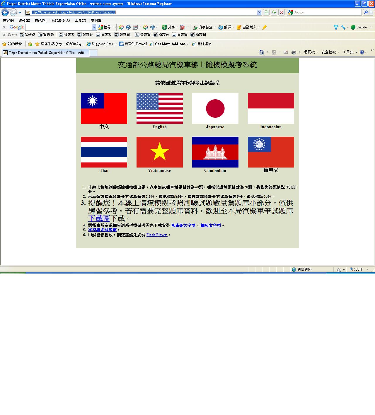 In Taiwan, the written test is on the computer. It consists of forty questions on all facets of driving. There are true-false questions, and multiple-choice questions. There are pictures of signs that you need to know, there are questions related to how your car works, there are driving questions and questions about the law. In order to pass you must get an 85%. I will share the test in detail, in the next episode in this continuing saga. There is one fly in this particular ointment, and that is that you can take the written test in a number of languages including Psuedo-English but all of the books to study are in Chinese. But don’t despair because they have prepared a number of mock tests that if you practice them you can learn the right answers to the questions and eventually take and pass your driver’s license test. The practice tests you can take on-line can be found at http://driversimtest.thb.gov.tw/DriverSimTest/mocks/index.do.