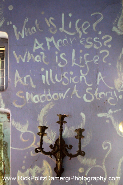 The hotel is a fading majestic butterfly and her old dalmation with his dull greying coat and wracked with arthritis once sleek, proud and beautiful is a living metaphor for the bizarre retreat in Kandy’s hills. Yes, there are cobwebs, and yes it is over-priced and yes the decor is decaying but the essence of Helgas Folly. Referred to by Helga as ‘’she’’ and ‘’her’’ still very much remains, and that for me is why it was worth every penny. The building itself is a labyrinth of different emotions from inside the owners mind. Helga explained when she was going through her first divorce she went ‘’slightly mad’’ and began painting in a crazed frenzy as therapy, the result is an eccentric Alice in Wonderland on LSD effect.