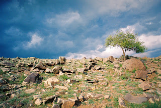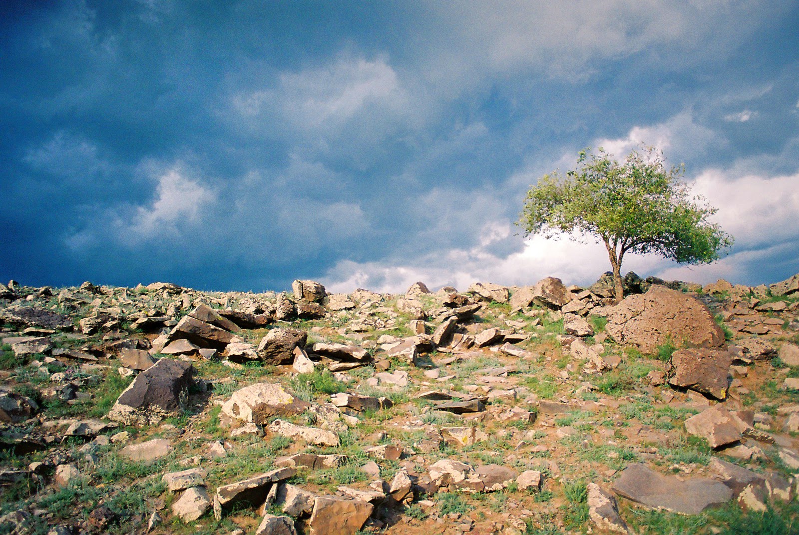 I found this photo in my archive that I took during an expedition across Mongolia along the northern provinces. This was snapped for a moving Landcruiser. The day was mixed with squalls of rains, clearing, and then overcasts with drizzle. The sun would peer through the edge of cloud fronts and at times lighting the bottom of the overcast from across the horizon. This made for a very mixed colored sky with nice contrasting details and shadows. Unlike other shots recently posted this one is 35mm film taken with an old school Nikon and Sigma lens. In this view I especially like the turbulent blue and gray skies and how the tree looks almost like it’s aflame amid the scattering clouds. The terrain is craggy with rocks and this pace is wind swept.