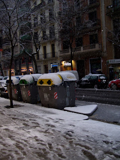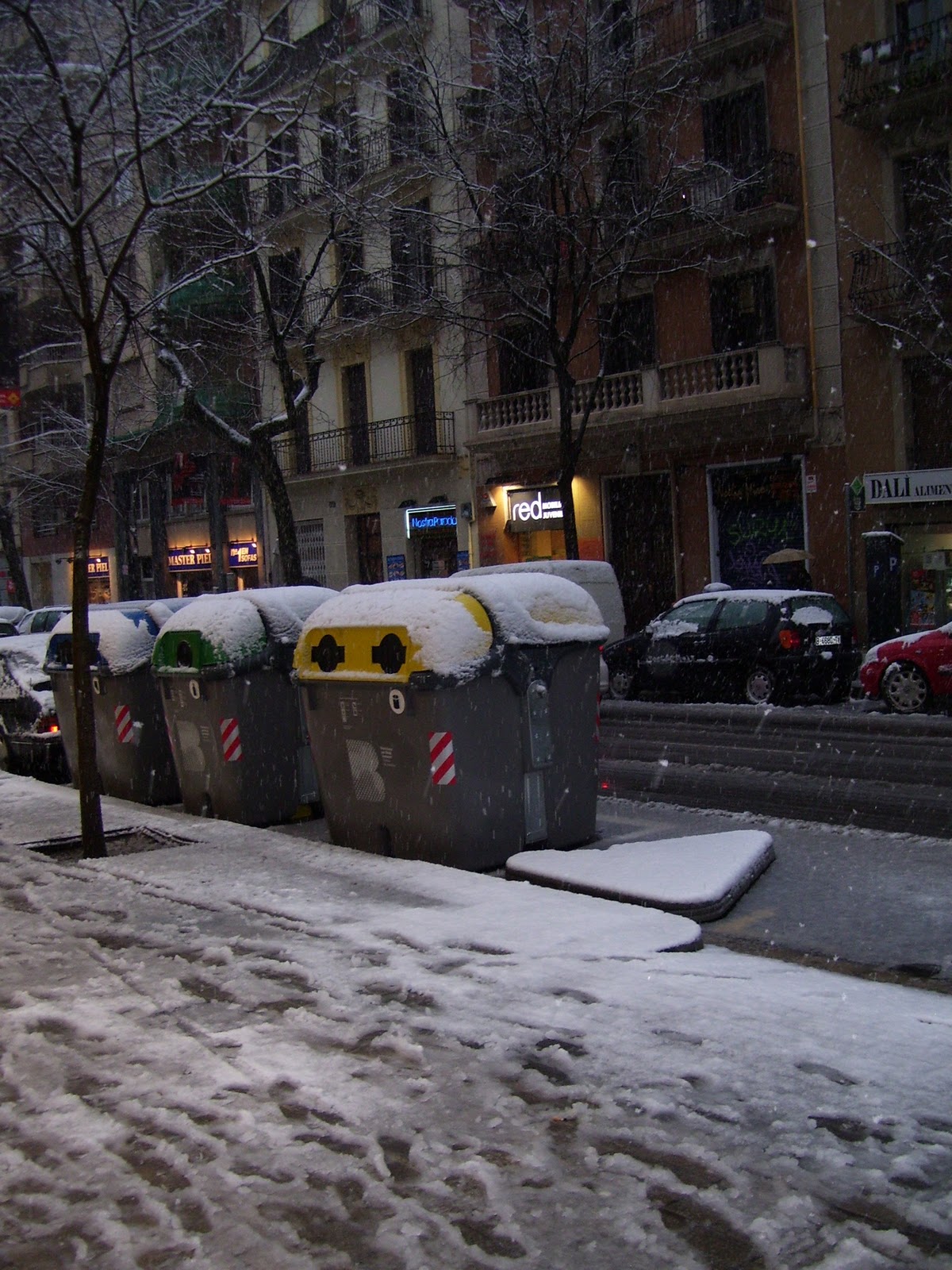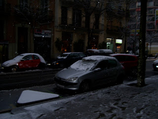 The space between clouds and earth is electric, green-grey spotted with white. Little old ladies look up from wet feet and peek out from under their umbrellas. The sky crackles and thunder reverberates as my favorite variation on the thunderstorm begins: thunder-snow. Deep grumblings from the clouds send so many ice crystals flailing down upon a foreign land. But unlike their predecessors, power in numbers will win the battle for this second, violent round of snow. Barcelona has been taken, and is currently occupied by parked cars, balconies and palm trees blanketed in white. Slush in shades of grey, black and brown forms banks along the curbs and spreads its slippery fingers across streets and sidewalks